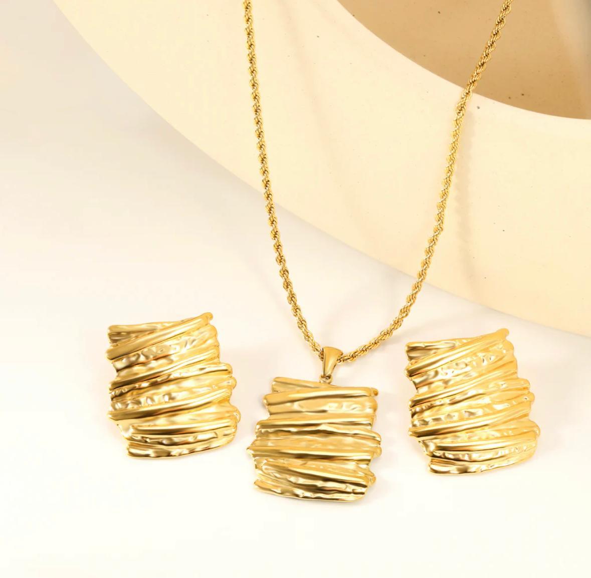Raw texture, refined form. This matching necklace and earring set features stacked gold bands that evoke layers of earth and time—each curve a tribute to natural rhythm and artisanal strength. The pendant’s dimensional silhouette and the earrings’ mirrored design create a harmonious balance of boldness and grace.